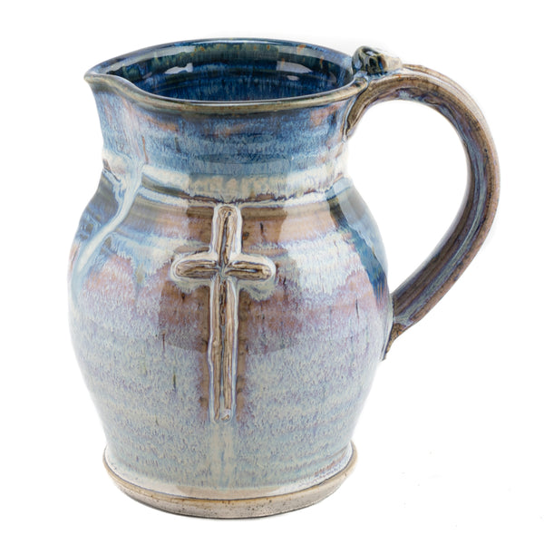 This unique, hand-thrown stoneware (ceramic) pastel flagon stands 8 inches tall and holds approximately 45 fluid ounces. This large flagon features a raised design of the old rugged cross.