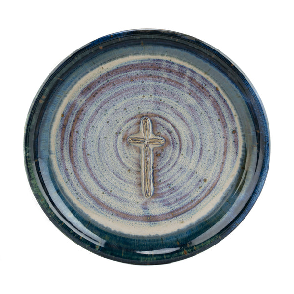 A custom pastel glaze and raised old rugged cross design makes this unique stoneware (ceramic) piece of pottery a must-have for any communion collection.